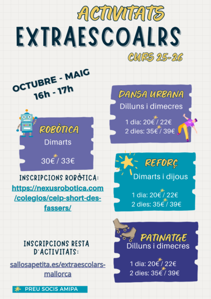 La proposta d’activitats extraescolars del curs 25-26, aprovada pel Consell Escolar al juny de 2025, és a càrrec de l’empresa Sa Llosa Petita i l’activitat de robòtica que la du a terme l’empresa Nexus.